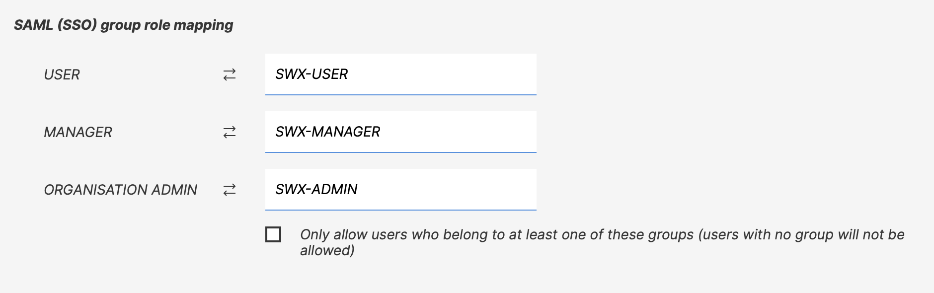 If the user belongs to multiple roles (for example, SWX-MANAGER and SWX-USER) in the above example, they will be granted the highest permission that they match with. In this example that would match to the manager role.