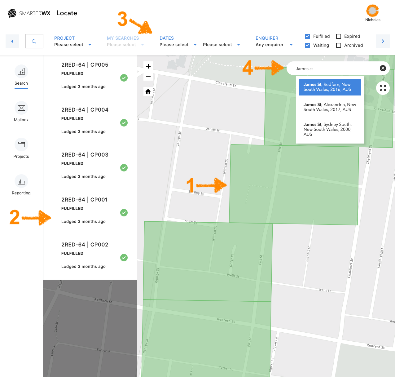 The map search page is the entry point for SmarterWX Locate and allows you to find and view enquiries and responses.