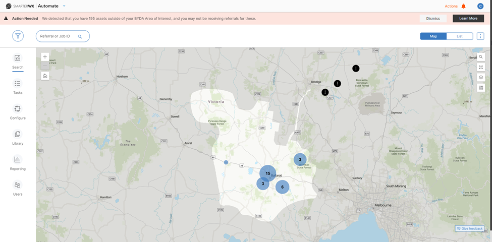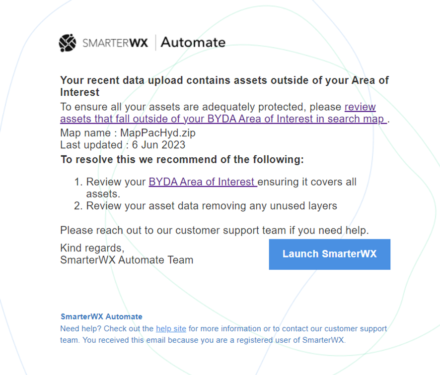 The Asset Protection Alerts feature uses the Area of Interest (AOI) in the BYDA service and compares it with the map data uploaded in SmarterWX Automate. If the map asset layer is not contained within the BYDA service AOI, a notification will be generated within the application. This feature helps users visualise any unprotected assets in the SmarterWX Automate search map and encourage user to take the necessary actions either updating the map data or AOI in BYDA.